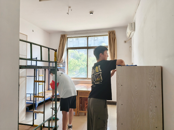 在新生辅导员的带领下,志愿者们分组协作,佩戴党徽,手持扫把、抹布等工具,对宿舍进行全方位打扫,有条不紊的投入清扫工作。重点清理地面灰尘、擦拭家具表面、整理公共区域,确保宿舍环境整洁卫生。