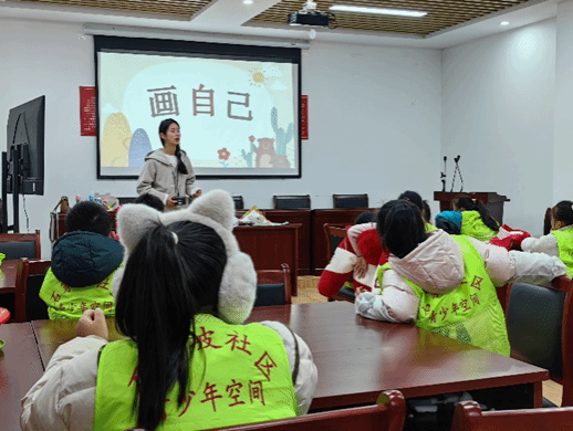 在“画自己”心理健康小课堂上,志愿者们为孩子们带来一场生动的心理课,引导孩子们通过对自己进行自画像,认识自身的特质与彼此的差异,提升孩子们的自我认识、性别意识,增强自信心,并体验到画画的乐趣。