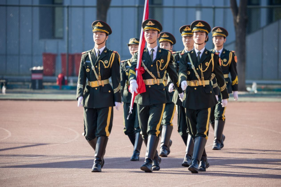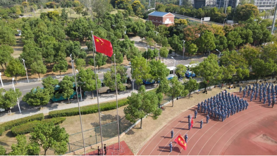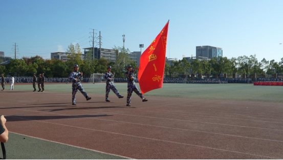 阅兵大会上,国旗护卫队迈着铿锵步伐入场,五星红旗在雄壮的国歌声中冉冉升起,军训新生们心潮澎湃,致敬国旗,致敬祖国!