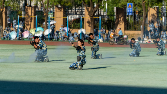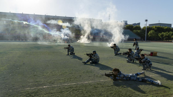 战术方阵汇演中,57名化药本科新生如铁流涌动,身手矫捷,配合默契,战术动作精准有力,队形变换迅疾而有序,展现出战士般的坚韧与智慧,令人叹为观止,尽显国防教育成果。