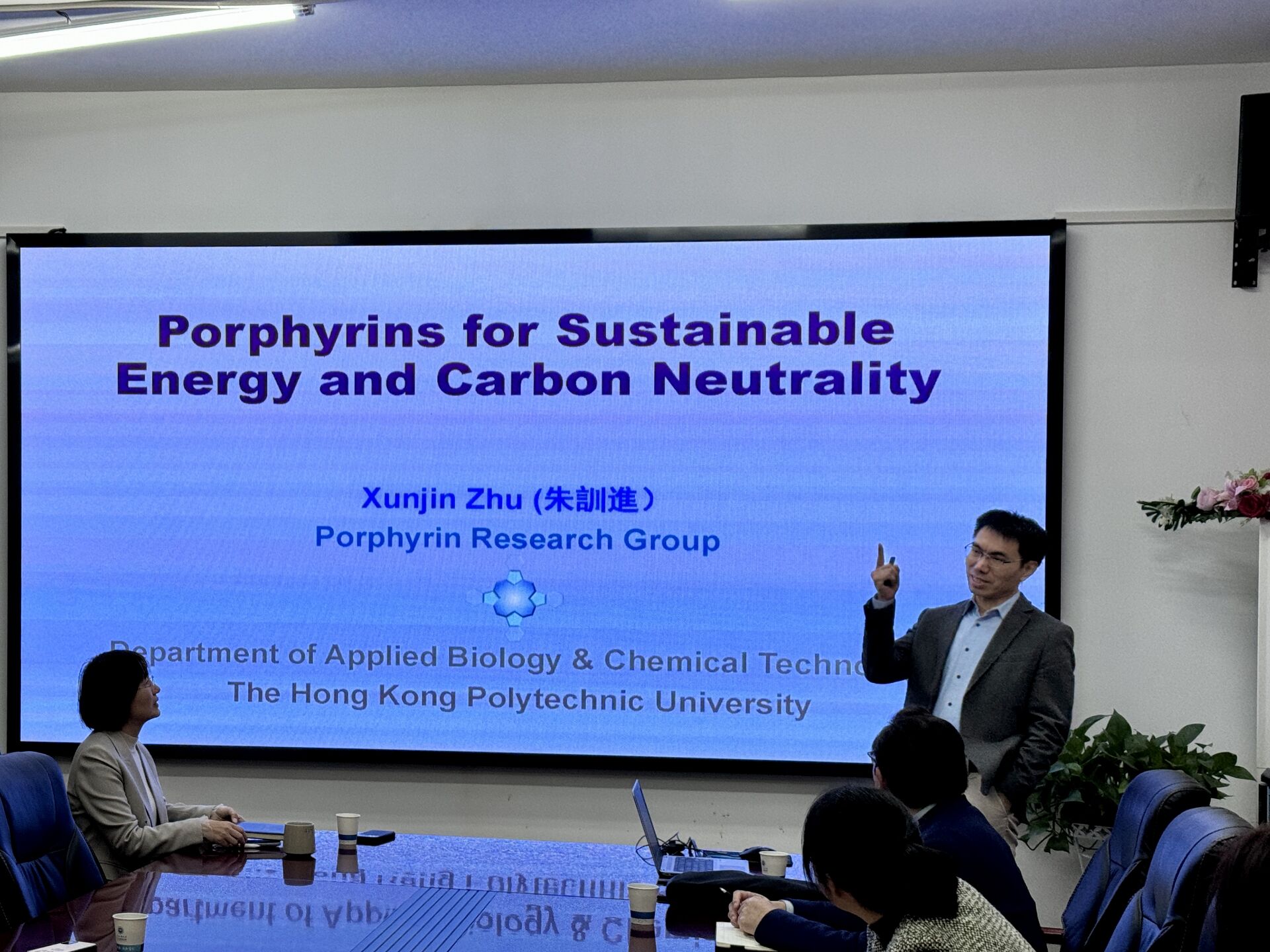 朱训进教授以“Porphyrins for Sustainable Energy and Carbon Neutrality”为题,围绕卟啉及其衍生物,分享了其团队在有机太阳能电池、光催化和电催化等领域的最新研究进展。详细介绍了其团队通过卟啉分子的结构调控,实现在紫外—可见—近红外全光谱高效吸收,并在有机异质结太阳能电池应用取得的显著成果。朱教授还分享了其团队为解决卟啉在光催化领域发光弱和易聚集的难题,采用发光体吸收转化光和铂代替重金属,稳定实现高效产氢,该项技术对推动低碳排放的光伏制氢具有重要意义。