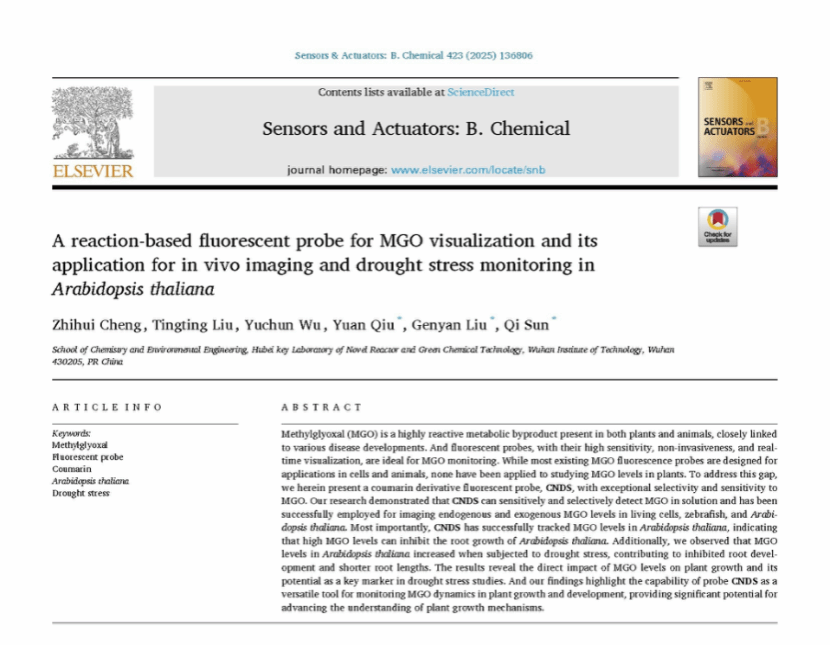 本网讯(通讯员 徐志强)近日,伟德betvlctor1946源于英国化学工程与工艺专业2021级本科生程智慧以第一作者在国际知名期刊Sensors and Actuators: B. Chemical(中科院一区TOP期刊,影响因子8.0)发表了题为《A reaction-based fluorescent probe for MGO visualization and its application for in vivo imaging and drought stress monitoring in Arabidopsis thaliana》的学术论文。伟德国际victor·1946源自为唯一署名单位,伟德betvlctor1946源于英国药物先导与功能分子团队刘根炎教授与孙琦副教授为论文共同通讯作者。