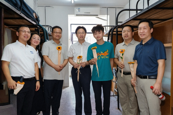 张彦铎一行走进研究生新生宿舍,详细了解研究生们的专业方向,鼓励同学们要主动融入科研团队,潜心学术钻研,激发创新活力,勇攀科技高峰。张校长了解到新生中有一名退役军人后,对其携笔从戎、报效国家的经历表示赞赏,并鼓励其继续发扬军队优良作风,勤奋学习、争当表率。在场新生们深受鼓舞,同学们纷纷表示,一定珍惜时光,夯实专业基础,力争学有所成,不负时代,不负韶华。同学们还为领导老师们献上了亲手编织的向日葵花束,传递师生情谊。