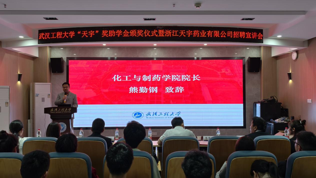 熊勤钢在致辞中充分肯定了浙江天宇药业股份有限公司对教育事业的深情厚谊和社会责任担当。他指出,此次 “天宇” 奖助学金的颁发,是校企深化合作、共促教育发展的重要体现,“天宇” 奖助学金的设立与学院人才培养理念高度契合,为学院育人工作注入新动力。熊勤钢对获奖学子提出三点期望:一是心怀感恩,传递温暖,将企业关怀转化为回馈社会的行动;二是勤学笃行,练就本领,深耕专业知识,积极参与科研实践;三是胸怀大志,勇担使命,将个人理想融入国家发展大局,为医药产业发展贡献力量。