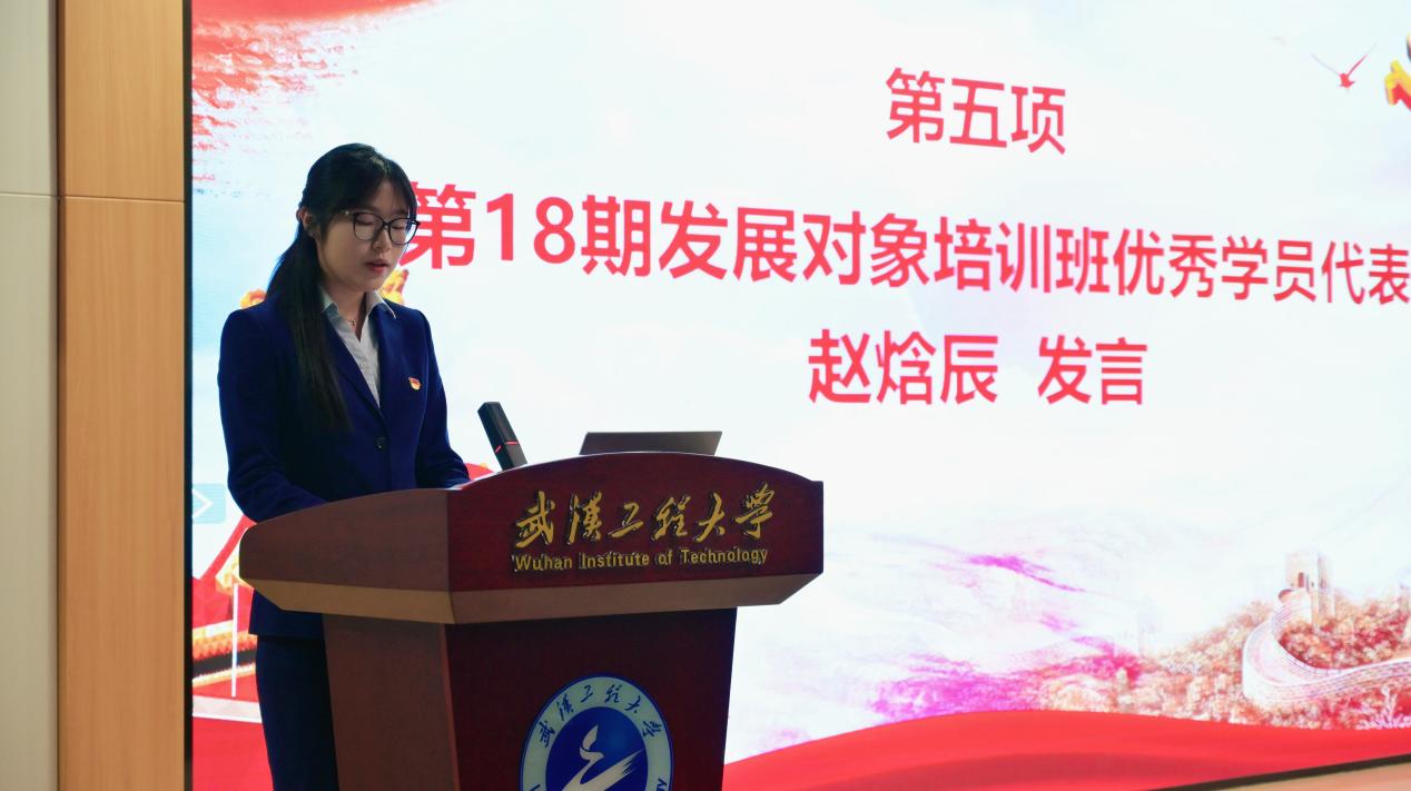 第18期发展对象优秀学员代表赵焓辰结合自身学习经历分享感悟,一是以“空杯心态”投入理论学习,补足精神之“钙”;二是以“融合思维”学以致用,联系专业实际,将学习成果转化为服务同学、科技报国的实际行动;三是以优良作风锤炼党性,严守培训纪律,展现新时代化药青年的良好形象。